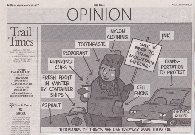 I heartily applaud the Trail Times for publishing the editorial cartoon entitled "Thousands of things we use everyday made from oil" (Trail Times, Nov. 22). With politicians encouraging the transition from hydrocarbon fuels to renewable energy, it is important we recognize the deprivations, if not the grinding poverty, we will have to endure in a carbon-free economy.